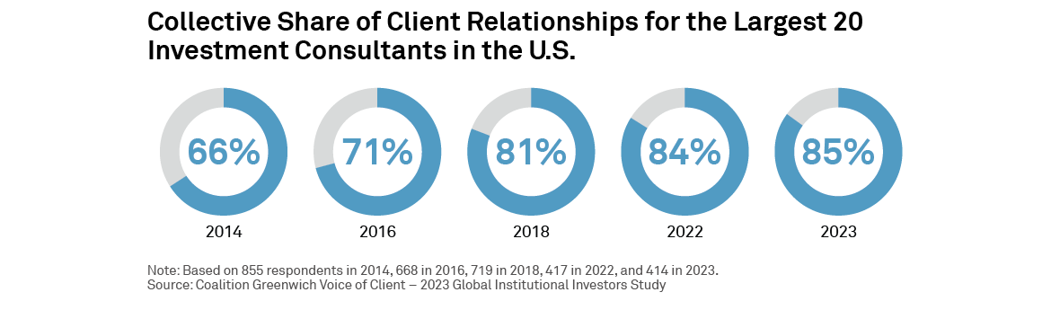 A growing number of those institutional relationships are held by the largest consultants in the industry. In 2014, the top 20 investment consultants in the United States held about 66% of institutional client relationships, but by 2023, consolidation drove the number up to approximately 85%.