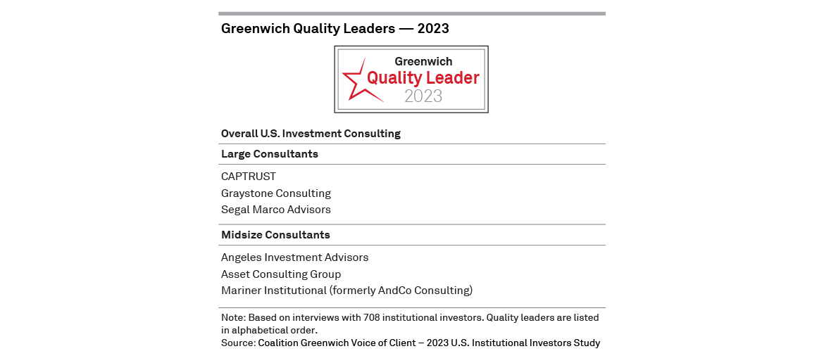 This year’s Greenwich Quality Leaders have distinguished themselves by receiving the top GQI score. The following tables present the complete list of 2023 Greenwich Quality Leaders in U.S. Investment Consulting.