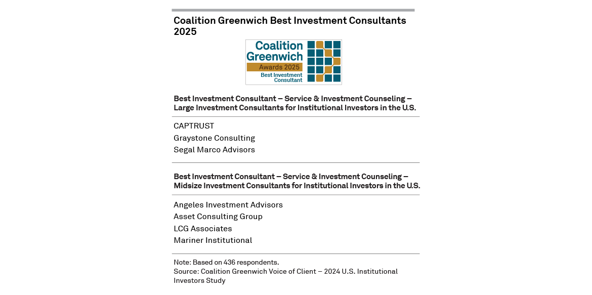 The Coalition Greenwich Best Investment Consultants all excel at building deep relationships that deliver tangible benefits to asset owners and stand the test of time. The tables below present the complete list of 2025 Coalition Greenwich Best Investment Consultants in service and investment counseling in the U.S.