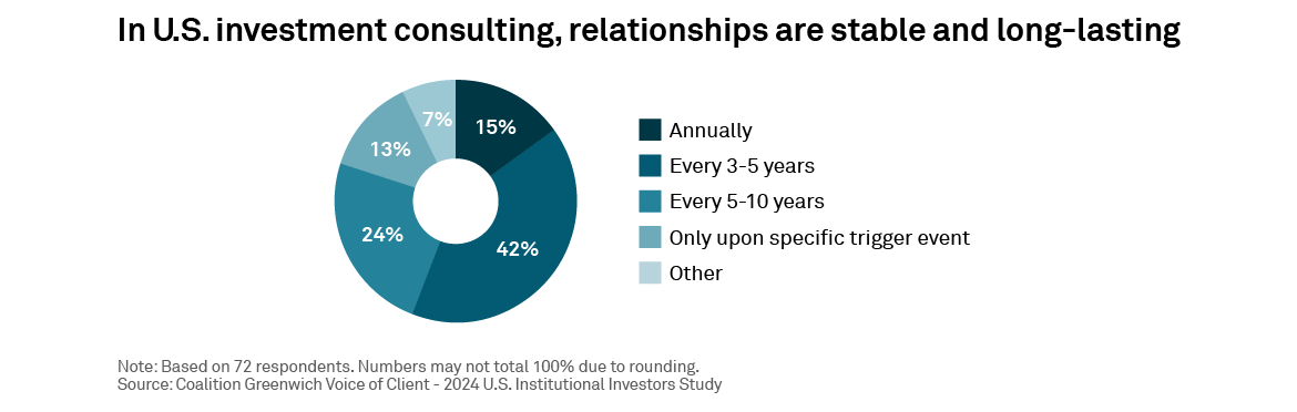 In the United States, more than 40% of asset owners say they review their investment consulting relationships every 3–5 years, with another 24% waiting 5–10 years. For 13% of asset owners, their investment consultant relationship is not reviewed at all unless a specific issue, usually related to fees or investment performance, triggers some action.