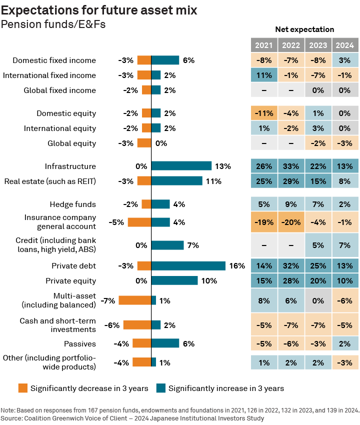 In what could be a silver lining for traditional asset managers in Japan, it seems that at least part of the slowdown in manager hiring could be coming from private markets. Like investors around the world, financial institutions and pension funds in Japan have been making a big push into private assets. In 2023, nearly 40% of Japanese financial institutions and more than a quarter of pension funds were planning significant increases to private debt allocations over the coming three years. Japanese investors were also bullish about future allocation increases to alternative asset classes such as infrastructure and private equity.