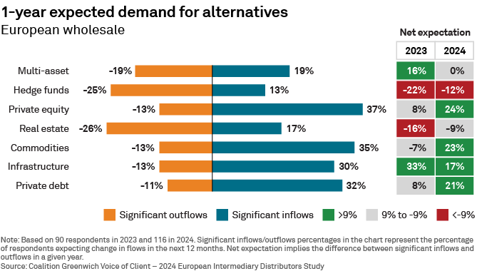 Meanwhile, investors are generally planning to increase allocations to alternatives. As shown in the graphic above, more than a third of intermediary fund distributors in continental Europe and the United Kingdom expect investors on their platforms to significantly expand allocations to alternative asset classes such as private equity, commodities and private credit in the next year.