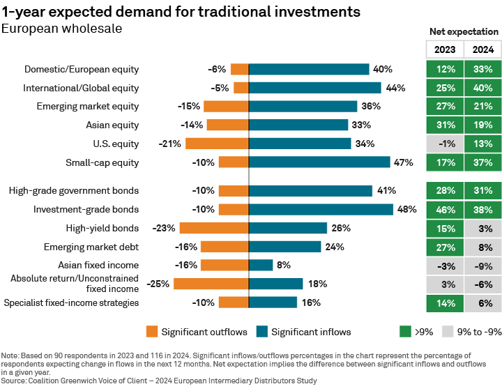 However, it’s important to note that expected demand for traditional equity and fixed-income strategies is likely not only to hold up next year, but to top demand for alternatives by a sizable margin. That’s the “lite” in barbell lite. As shown below, more than 40% of intermediary fund distributors in Europe expect investors on their platforms to significantly increase allocations to a list of traditional asset classes ranging from international/global equities and small-cap stocks to investment-grade bonds.