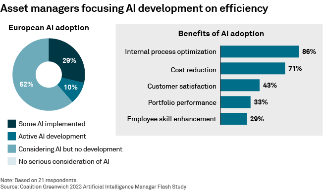 AI should be helping managers capitalize on this opportunity. Nearly a third of European asset managers say they have implemented AI or are in active development of AI applications. For the most part, however, these early AI initiatives are focused on optimizing internal processes and lowering costs.