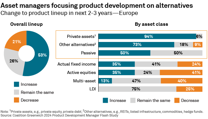 Although demand for traditional active strategies appears solid for the moment, we believe investors in Europe and around the world will continue moving from “barbell lite” toward a fuller barbell approach, as managers continue to roll out new semi-liquid products designed for the wealth channel and opportunities to take on private and alternative exposures expand. Almost 95% of the European asset managers participating in a 2024 special study on product development expect to expand their product lineups in private markets, and nearly three-quarters expect to increase the number of alternative products they offer overall.