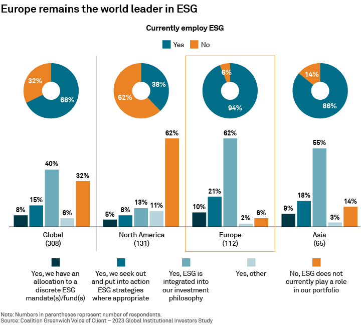 More recently, asset managers have responded to demands from the market and regulators by fully integrating ESG into their core investment processes and every investment product. Today, 62% of European asset managers have fully integrated ESG into their investment philosophy. Again, that approach diverges dramatically from practices in North America, where only 13% of managers say they have integrated ESG into their investment processes.