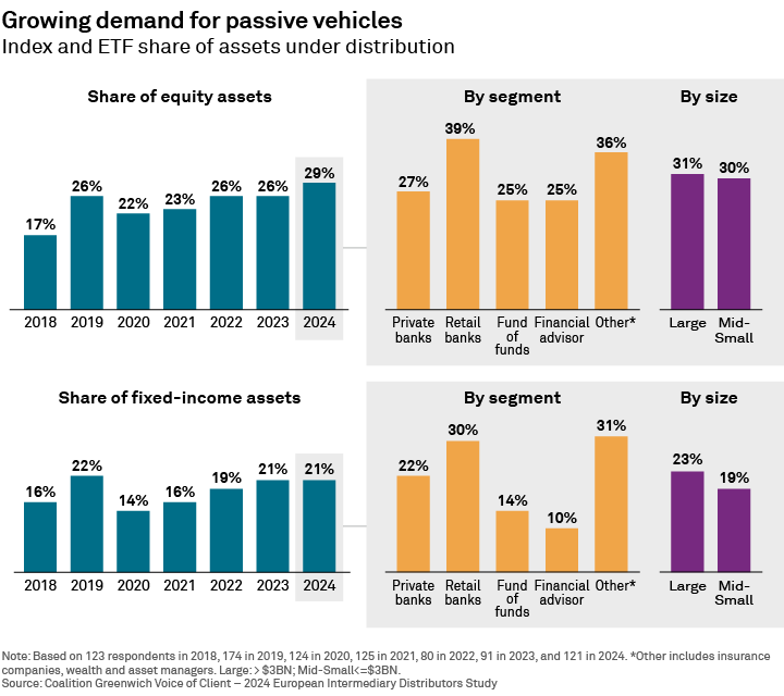 European investors are adopting this approach but at a slower pace and on a smaller scale than we’ve seen in other regions, North America in particular. For example, investors on intermediary distribution platforms in continental Europe have been steadily increasing their allocations to index and ETF products, typically for passive strategies, which have grown from just 22% of total assets in 2020 to 29% in 2024. In fixed income, allocations to these products increased from 14% in 2020 to 21% in 2024.