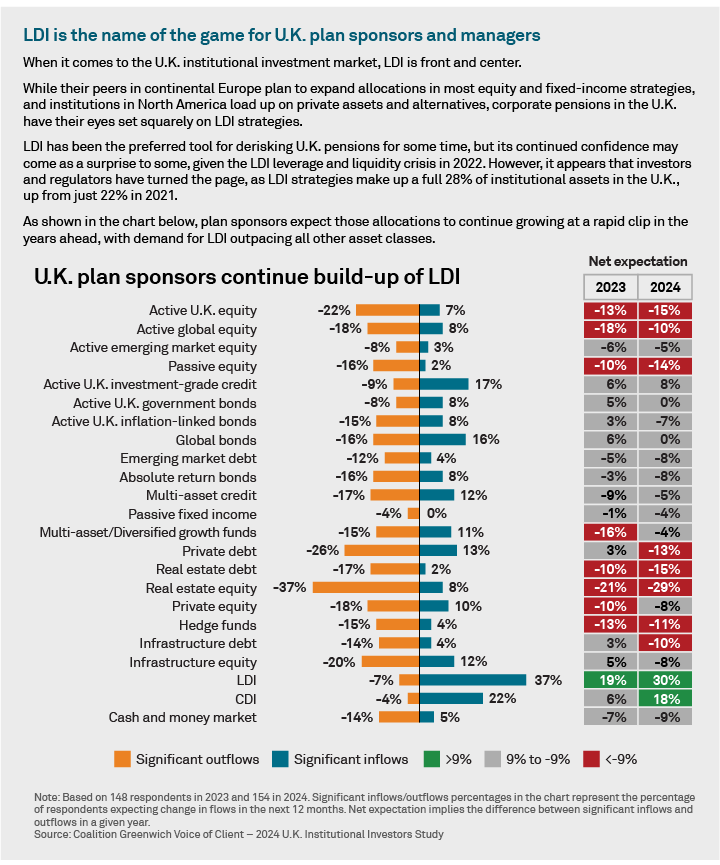 European investors enter 2025 with a surprising level of optimism given the set of economic, political and geopolitical challenges facing Europe’s investment markets. In continental Europe, pension funds, insurers and other institutions expect to significantly increase allocations to equity and fixed-income products in the year ahead, while also increasing their exposures to alternative asset classes. In the United Kingdom, corporate plan sponsors are committed to immunizing defined benefit pension schemes and plan to continue that work by upping their allocations to liability-driven investment (LDI) strategies.