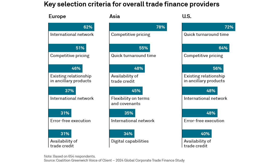 Reflecting that challenging funding environment, roughly half of large corporates across the Asia region now cite “availability of trade credit” as one of the key reasons for choosing a bank for transaction banking services, versus 40% of US corporates and only around 30% of large companies in Europe.