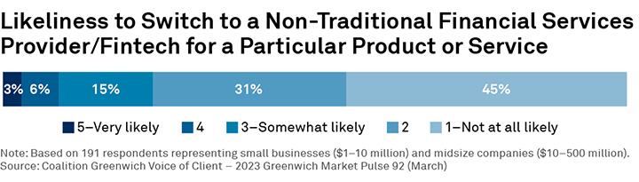 There is a silver lining for banks: For the moment at least, most small businesses and midsize companies remain hesitant about entrusting essential services to fintechs. More than three-quarters of commercial banking clients say they are unlikely to switch to fintechs for any product or service.