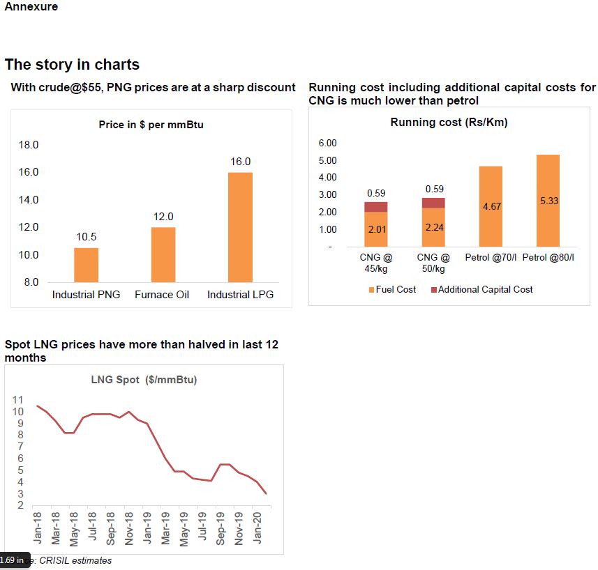 Says Manish Gupta, Senior Director, CRISIL Ratings, “At a Brent crude price of $55 per barrel, the landed cost of furnace oil would be about $12 per mmBtu, while Industrial LPG will be about $16 per mmBtu. On the other hand, industrial piped natural gas, apart from being cleaner, is significantly cheaper at $10.5 per mmBtu.”