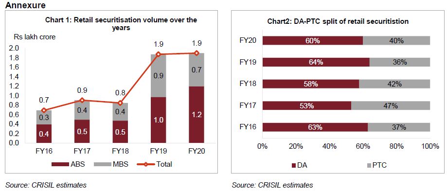 Says Krishnan Sitaraman, Senior Director, CRISIL Ratings, “There was a sudden meltdown in volume last fiscal in March, when transactions typically peak. Pass-through certificate (PTC) issuances, for instance, dropped to around Rs 9,000 crore, compared with Rs 15,000 crore in March 2019.”