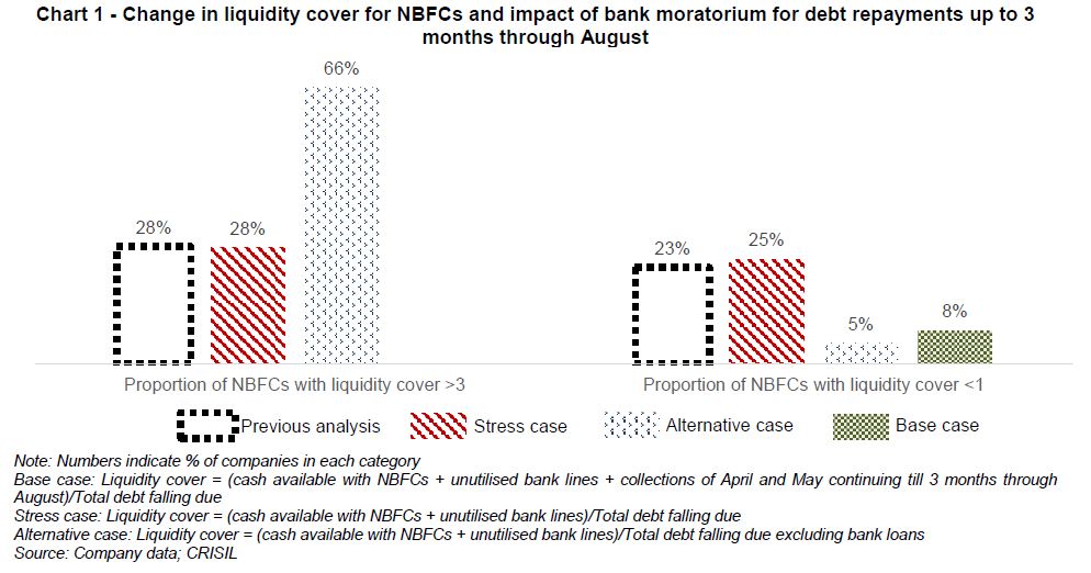 For the latest analysis, CRISIL looked at three scenarios: (i) a base case, where it is envisaged that collections in the next few months will be similar to April-May levels without any moratorium on liabilities; (ii) a stress case, where collections are nil and there is no moratorium on liabilities, leading to depletion of liquidity cover; and (iii) an alternative case, where NBFCs get benefit of moratorium on their bank loans but there being no collections. The inferences from these scenarios are presented in the table below.