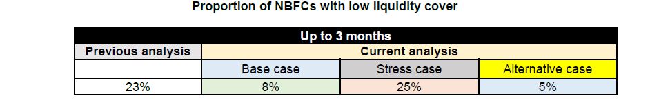In the base-case scenario, the proportion of NBFCs with liquidity cover of less than 1 time (low liquidity cover4) will be 8% during the three months through August. Our earlier analysis had estimated 23% of NBFCs will have low liquidity cover in this period.