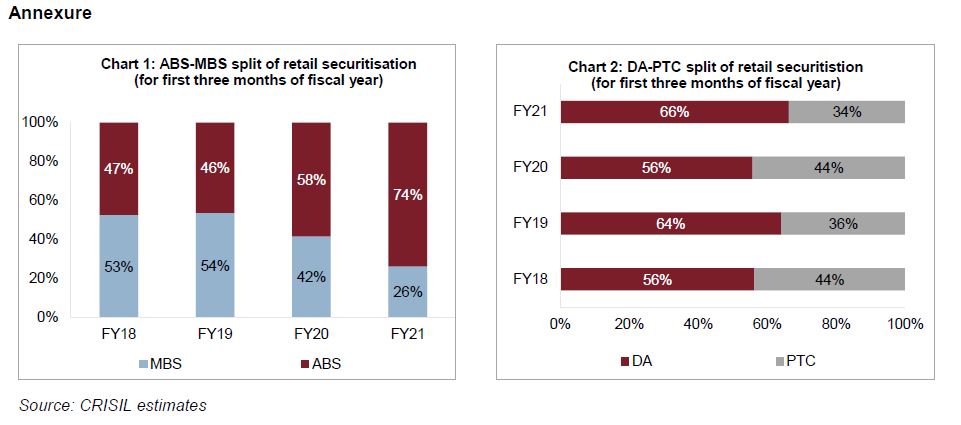 Asset-backed securities (ABS) remained the dominant segment comprising 74% of the overall securitised volume in the quarter (58% in Q1 of fiscal 2020) (see Chart 1 in Annexure). Mortgage-backed securities (MBS) constituted the balance volume.