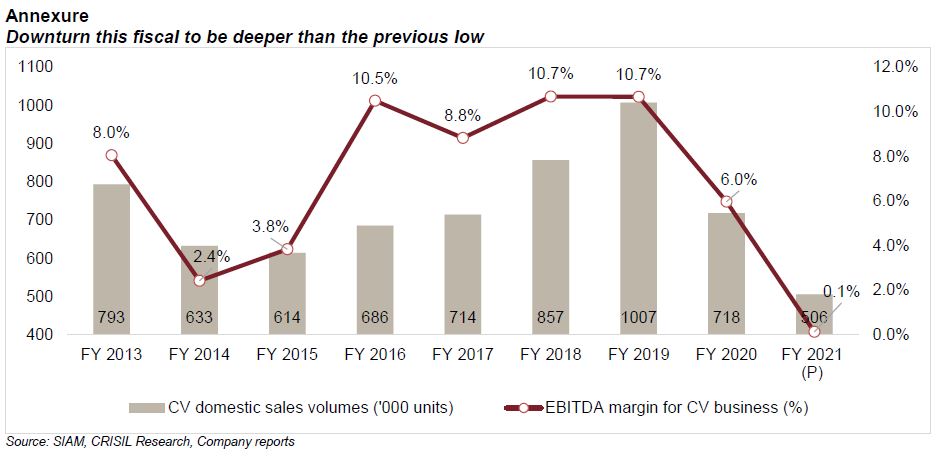 Commercial vehicles are a critical logistical link to the economy and hence sales volume is likely to bounce back next fiscal to reach almost fiscal 2020 level. That would substantially pull up the profitability of manufacturers, reverse the working capital stretch and restore credit metrics. A quick recovery in sales volume is critical; a slower rebound can elongate the pain for manufacturers.