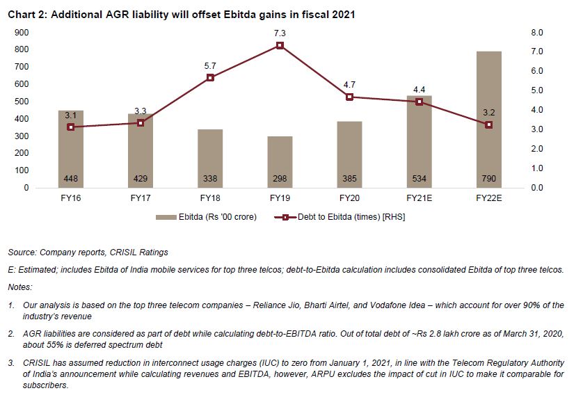 Says Nitesh Jain, Director, CRISIL Ratings, “The debt-to-Ebitda ratio will remain high at above 4 times in fiscal 2021 as the sizeable AGR liabilities will continue to weigh on the credit profiles of telcos. But, it is pertinent to note that despite getting relief in AGR payment terms, at this juncture, sponsor support, sizeable tariff hikes, and prudent capex would remain crucial to support the credit profile of telcos.”