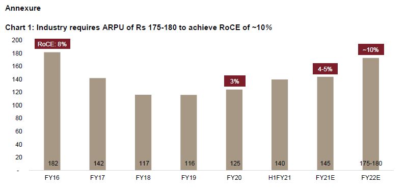 Telecom companies (telcos) have a compelling reason to push average revenue per user (ARPU) up by ~25% over the next 6-12 months to achieve a sustainable return on capital employed (RoCE) of ~10%, given their abysmally low returns at present and increased liability on account of adjusted gross revenue (AGR) dues.