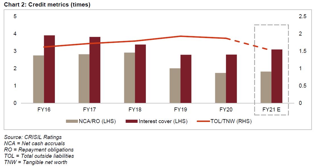 Says Himank Sharma, Associate Director, CRISIL Ratings, “Credit profiles should be resilient as key debt protection metrics are expected to improve due to deleveraging this fiscal. Interest coverage and the ratio of total outside liabilities to tangible net worth are expected to improve to 3.1 times and 1.5 times, respectively, compared with 2.8 times and 1.9 times in fiscal 2020. A moderation in capital expenditure, due to sufficient availability of capacity, will also support the debt protection metrics.”