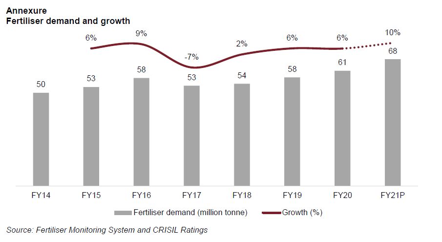 Says Nitesh Jain, Director, CRISIL Ratings Ltd “Higher sowing and early fertiliser purchases by farmers to secure supply amid the pandemic-induced uncertainty have meant the sales volume rose 11.7% in the first nine months of this fiscal. The monsoon this season has been a bounteous blessing at 109%2 of the long period average and the third-highest in 30 years, with good spatial and temporal distribution. Additionally, reservoir levels are at 117%3 of the past 10-year average, and soil moisture levels materially better. Not surprisingly, kharif sowing was the highest ever, while rabi sowing is up 2% on-year.”