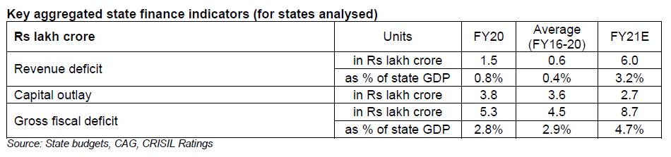 The Covid-19 pandemic-induced lockdowns and consequent slump in economic activity will hit tax collections of states and result in a near 4x expansion in their revenue deficits this fiscal, on-year. This will not only expand states’ aggregate gross fiscal deficit (GFD) to an all-time high of Rs.8.7 lakh crore, or 4.7% of GSDP, but also skew its composition1 towards revenue deficit which is relatively less value–accretive towards future tax potential.