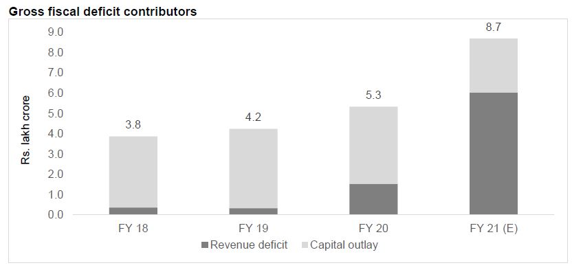 That is because of 15% on-year decline in revenue this fiscal. Revenue expenditures may also remain sticky as these are either committed (related to salaries, pension and interest costs), making it difficult to cut, or have been necessitated by the pandemic (such as grants-in-aid, medical and labour welfare related expenses). High revenue deficit will also compel states to moderate their capex to remain within fiscal borrowing limits,3 thereby aggravating the GFD skew.