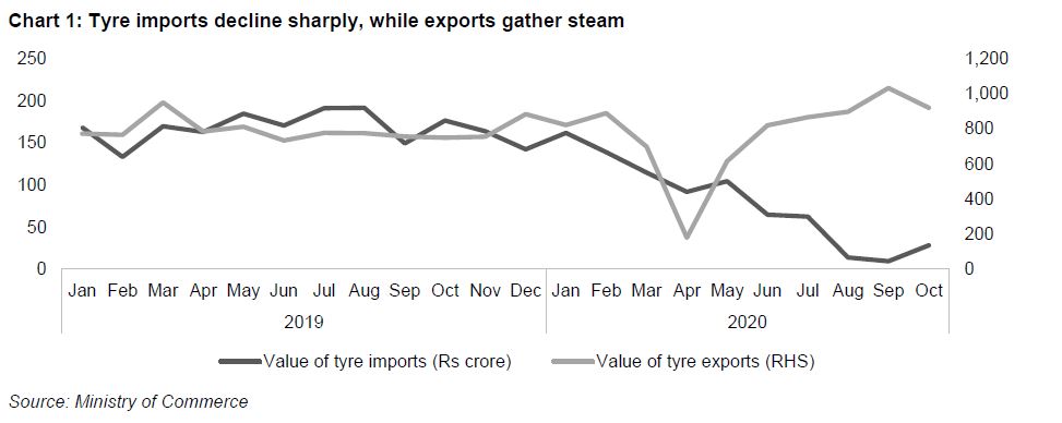 Pick-up in OEM demand across vehicle segments and higher replacement demand for CV tyres following recovery in economic activity will drive domestic volume up next fiscal. Operating margins of tyre manufacturers will sustain at 13-14%, driven by higher volume and continued pricing flexibility, supported by favourable import policies.