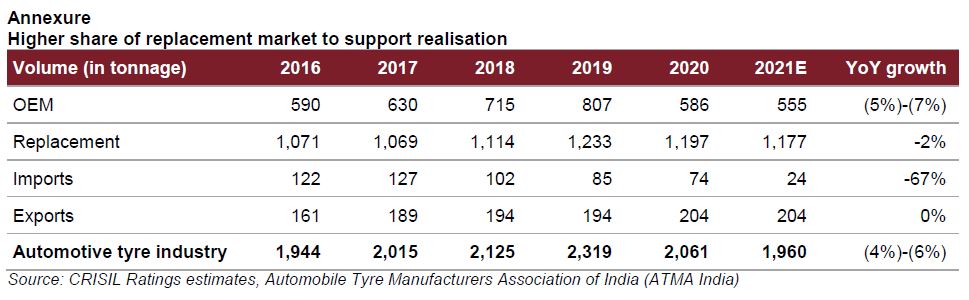 Says Anuj Sethi, Senior Director, CRISIL Ratings Ltd, “Improved realisations on account of increased share of replacement demand (to 60% from 58% in fiscal 2020) and exports, which command better prices, will drive the increase in operating profits of tyre manufacturers this fiscal. Tyre makers have also increased prices in the domestic market after imports were placed on restricted list in June 2020. The average realisation per tonne of tyres is expected to increase 4-5% this fiscal.”