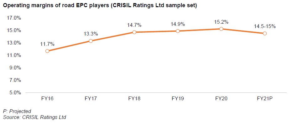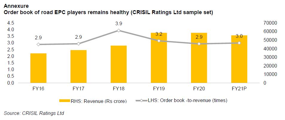 Says Priyanka Patawari, Associate Director, CRISIL Ratings Ltd, “Credit profiles of the sample set of road EPC players are expected to remain stable given minimal impact on business performance, and their healthy capital structure. Total outside liabilities to total tangible net worth ratio is expected to sustain at 1.5x this fiscal, with continuing prudent management of working capital. However, interest coverage ratio is expected to witness a moderation to ~3x from ~3.5x in fiscal 2020 due to lower operating profits.”