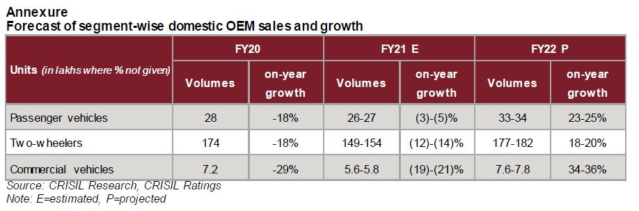 Says Hetal Gandhi, Director, CRISIL Research, “The ongoing rebound in economic activity will drive a strong recovery for OEMs next fiscal. Improving fleet utilisation and better availability of finance will also improve demand for commercial vehicles, while demand for personal vehicles (passenger cars and two-wheelers) will be driven by improving urban consumer sentiment, resilient rural incomes, modest vehicle price increases and attractive financing options.”