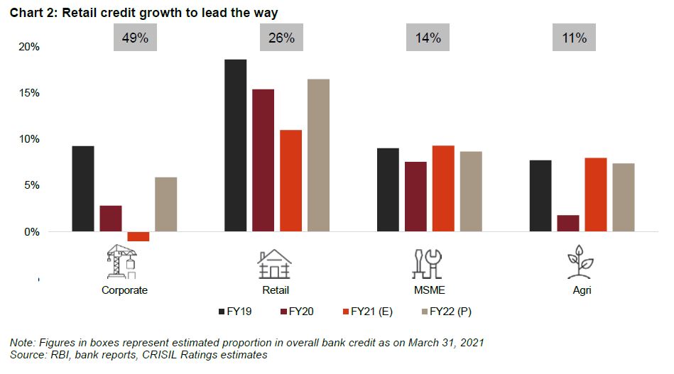 Agriculture credit has also contributed, with rural India seeing lower impact of the pandemic and a good harvest. Credit growth here is foreseen at 6-7% in both, this fiscal and next. The monsoon, though, will be a monitorable.