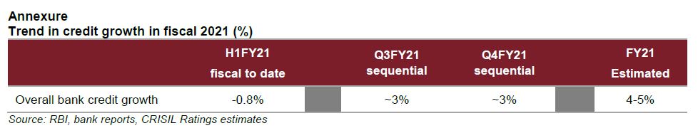 In the current fiscal, bank credit is seen rising 4-5% despite the sharpest contraction the Indian economy has seen since Independence. In June 2020, CRISIL Ratings had expected bank credit growth in this fiscal to be 0-1%.