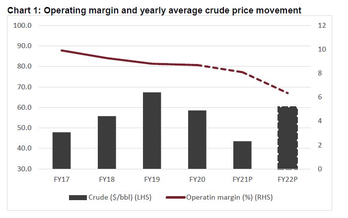 The raw materials used in footwear account for 40-50% of total cost of manufacturing. A significant portion of these are crude-linked. Crude oil prices have doubled this fiscal to ~$50 per barrel in December 2020 from ~$23 per barrel in April 2020. Crude prices are expected to average $55-60 per barrel next fiscal, driven by economic recovery leading to healthy demand. However, footwear companies will have limited flexibility to pass on higher input prices because their recovery would be nascent. As a result, their operating profitability will contract next fiscal (refer to chart 1).