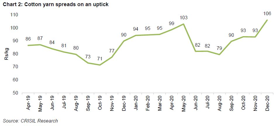 1 Refers to spread between domestic price of Shankar–6 (S-6) variety of cotton and domestic price of 40s count yarn. As cotton is the main raw material for manufacturing yarn, the spread directly impacts profitability.