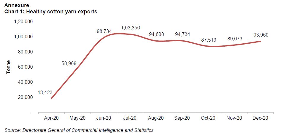 With global demand for knitted garments and home textiles recovering faster than expected due to extended stay-at-home period, and sharper focus on health and hygiene, exports of yarn to China, Bangladesh and Vietnam (which account for over half of India’s exports) rose 22%, 39% and 51%, respectively, on-year in April-December 2020 (see chart 1 in annexure). What has also helped is the US move to ban use of Xinjiang cotton, which has cranked up Indian yarn exports.