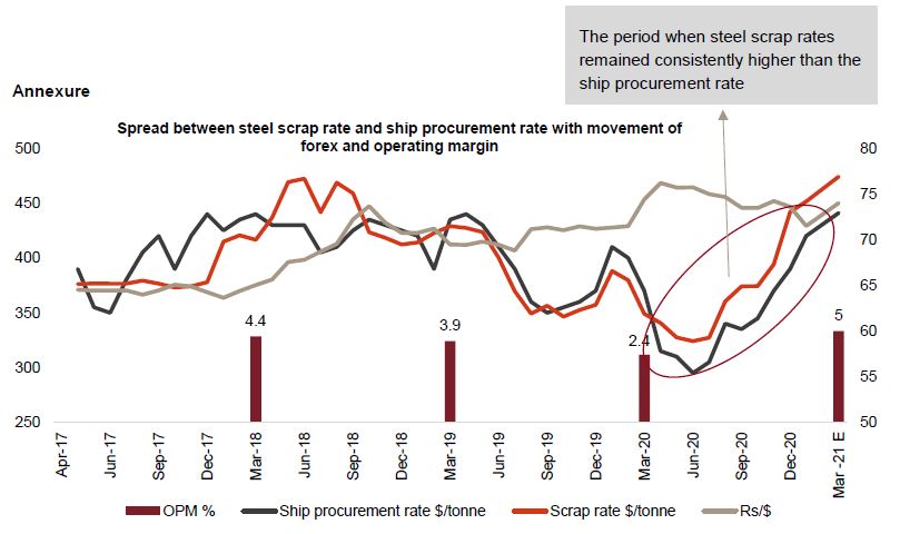 The Union Budget for next fiscal announced a reduction in duty on imported steel, which could lead to dumping from China and softer scrap rates. Increasing trade volumes in post lockdown period, has sent freight rates soaring, thereby bringing back lucrativeness in sailing vessels. As a result the supply of vessels for dismantling has been restrained in turn leading to firming up of procurement rates in the past three months. This could lead to moderation of operating profitability next fiscal. Any sharp drop in scrap prices will bear watching.