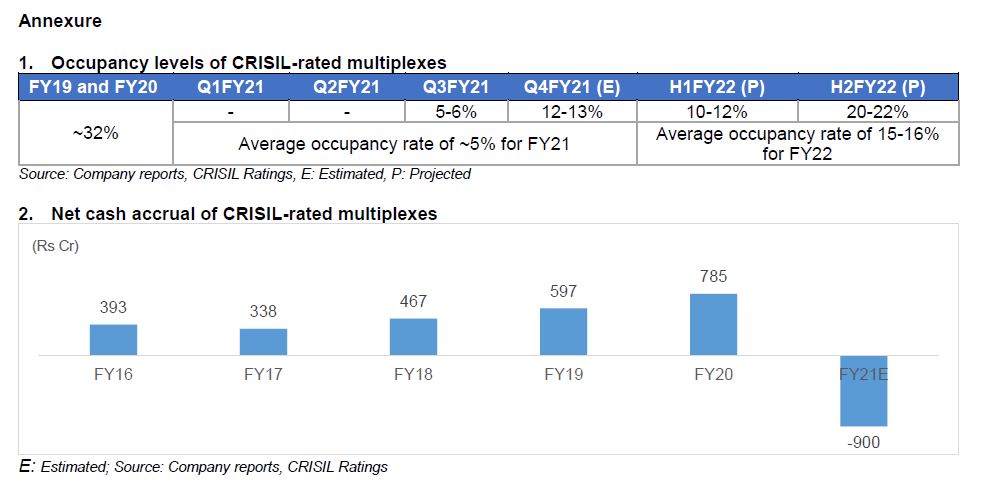 In the milieu, CRISIL-rated multiplex operators, which account for almost half of the industry’s revenue, are expected to log cash losses this fiscal, too. They had bled ~Rs 900 crore in fiscal 2021, compared with a cash profit of ~Rs 785 crore in fiscal 2020 (refer to annexure 2).