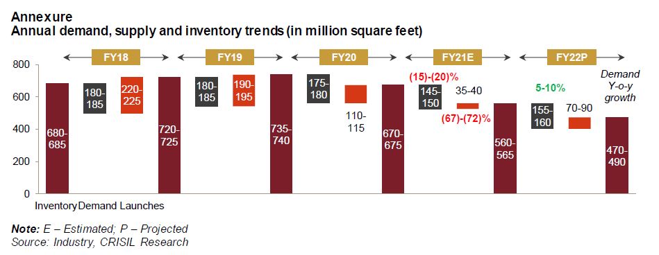 CRISIL expects a slowdown in new launches this fiscal, and developers to focus on sale of ready or near-complete properties, leading to a gradual reduction in inventory. Persistent impact of the pandemic on employment generation and incomes and, in turn, on demand for residential real estate, will bear watching.