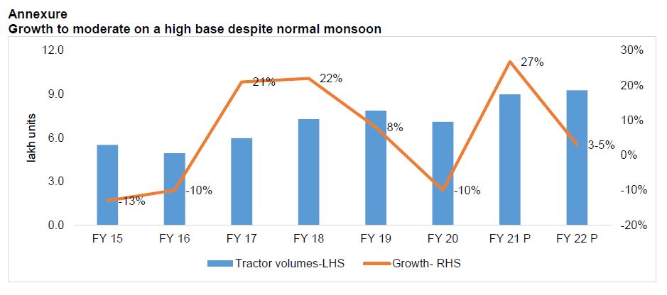 Additionally, increased government spending in rural India and prospects of higher minimum support prices for 2021-22, should buoy rural incomes. Also, non-agricultural tractor demand (20-25% of demand), which moderated last fiscal, is expected to recover, supported by recovery in rural infrastructure and mining activities compared with last fiscal.