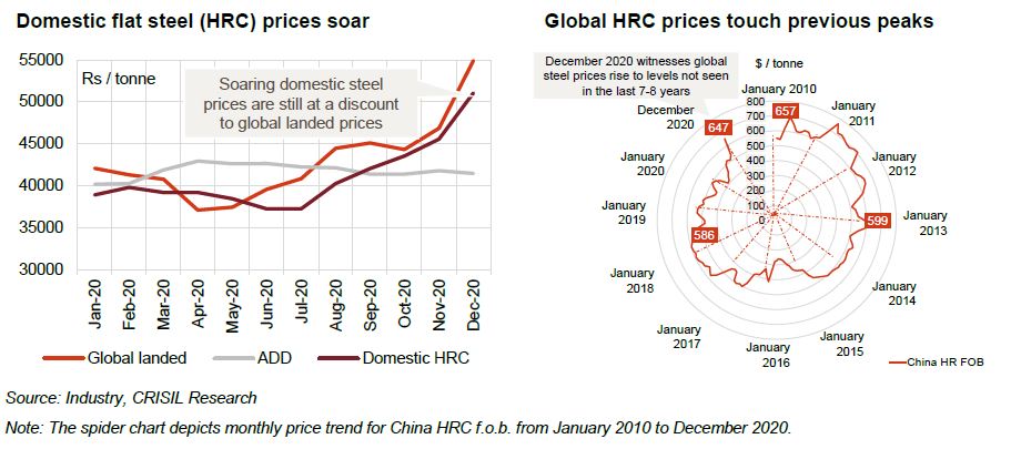 Global prices also touched an 8-year high in December on healthy demand and cost push from soaring iron-ore prices. Chinese crude steel production increased 8% in the period, while exports and inventories remained low indicating robust demand growth there.