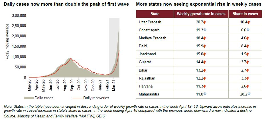 India’s second Covid-19 wave continues to spread fast, crossing the grim benchmark of 2 lakh daily infections in the week April 12-18. With numbers sustaining north of 2 lakh, the country now has the unenviable distinction of having the highest number of daily cases in the world, surpassing Brazil.