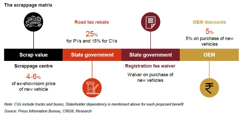 The Centre’s scrappage policy is unlikely to have freight transporters queuing up to replace old vehicles with new ones. The scrappage volume of buses, passenger vehicles (PVs) and two-wheelers will be limited as well, a CRISIL Research analysis shows.
