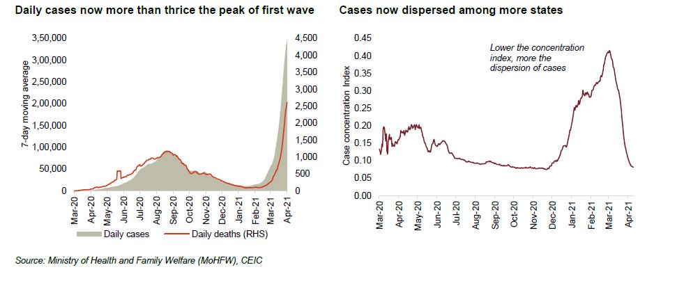 India’s second Covid-19 wave has wreaked havoc, with daily cases crossing a staggering 3 lakh in the week through April 25. India’s daily infections recorded the highest number of cases in a single day among countries worldwide in the last week, and daily deaths have crossed the peak of the first wave. Worryingly, their steep trajectory seems to be following that of daily cases.