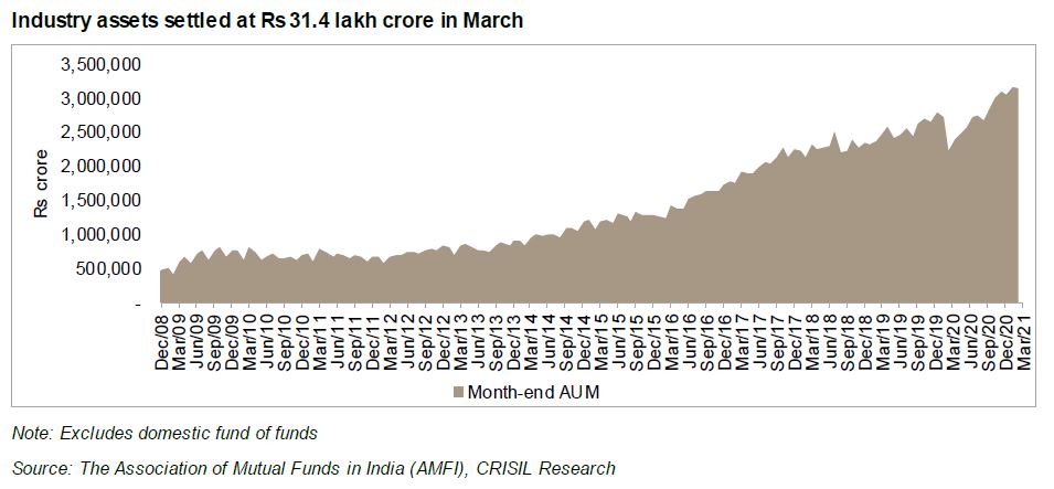 The domestic mutual fund industry’s assets under management (AUM) dipped ~1% on-month in March because of net outflows from open-ended debt funds. In contrast, open-ended equity funds recorded net inflows for the first time since June 2020. The last month of fiscal 2021 saw net outflows of ~Rs 29,745 crore and the industry’s asset base settled at Rs 31.43 lakh crore, coming off the record high of Rs 31.64 lakh crore the month before. In fiscal 2021, cumulative inflows equalled Rs 2.09 lakh crore, while the asset base expanded ~41%.