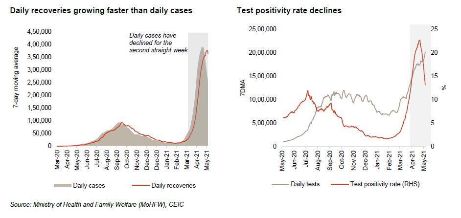 India’s Covid-19 affliction curve continues to trend downward for the second week in a row, as daily cases declined 22% sequentially in the week ended May 23 (faster than the 15% fall the week before). Daily new cases now average 2.5 lakh, down from 3.3 lakh in the week ended May 16. While daily cases have dipped, testing continues to increase, growing 11% in the last week. Accordingly, test positivity rate (proportion of daily cases to samples tested) has dropped to 13.1% (from 18.8% a week earlier). Recovery rate improved to 88.7% as of May 23 from 84.8% the previous week. With cases falling and recoveries rising faster, active cases over the week have declined for the first time since the second wave began, falling 17% on-week.