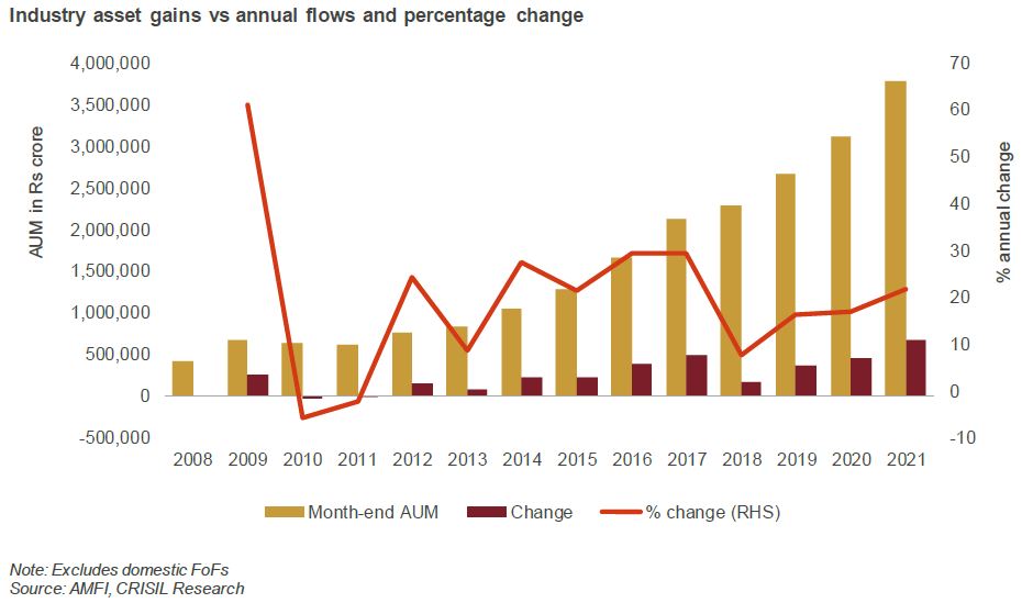 The industry added Rs 6.70 lakh crore — a record absolute asset gain for any calendar year on record, with the previous peak being Rs 4.80 lakh crore in 2017, followed by ~Rs 4.5 lakh crore in 2020. In percentage terms, the industry gained ~22% compared with ~17% in 2020.