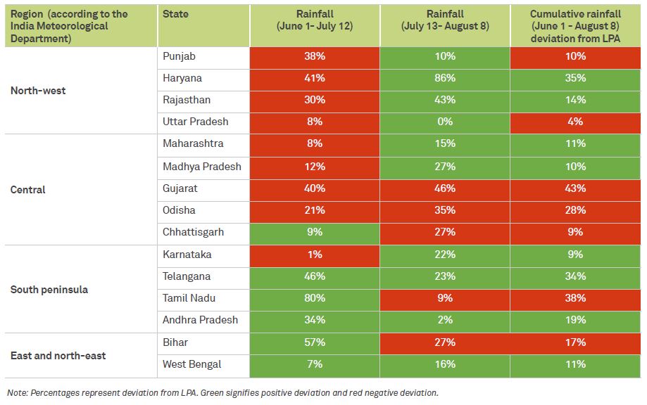 The patchy distribution of rains has perturbed many farmers. Gujarat, which accounts for 40% and 20% of total groundnut and cotton acreage, and Odisha, at 8% of total paddy acreage, are at a cumulative deficit of 43% and 28%, respectively. In contrast, Telangana, Andhra Pradesh and Haryana have received excessive rainfall as shown in the table below.