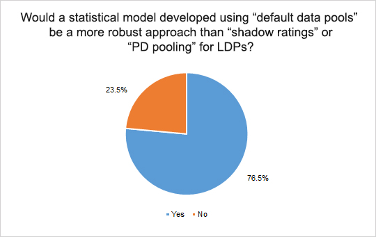 RISE presented the specifics of its LDP data pooling consortium solution, which pools data on both, defaulted and performing obligors, with the objective of enabling banks to carry out robust testing or even re-development of their models. The solution focuses on two specific portfolios – a) banks, and b) large corporates. These two portfolios are where the scarcity of defaults in most pronounced and also the likelihood of a creating rich dataset from pooling is high. RISE demonstrated how the solution works and that it is designed to meet regulatory requirements across of all major jurisdictions. In a closing spot poll, more than 75% of the banks agreed that a logistic regression model developed using ‘default pools’ would be more robust than current industry practices of shadow ratings based on a) either external agency ratings, or b) PD pooling consortiums.