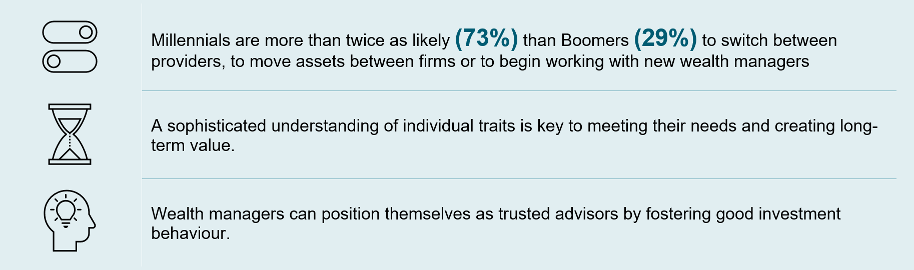 To tap into these segments, wealth management firms will need to adapt to the changing needs of “rewired” investors. Firms that rethink their approach to client acquisition and engagement, offering a more personalized, value-driven experience, will be best positioned to thrive.