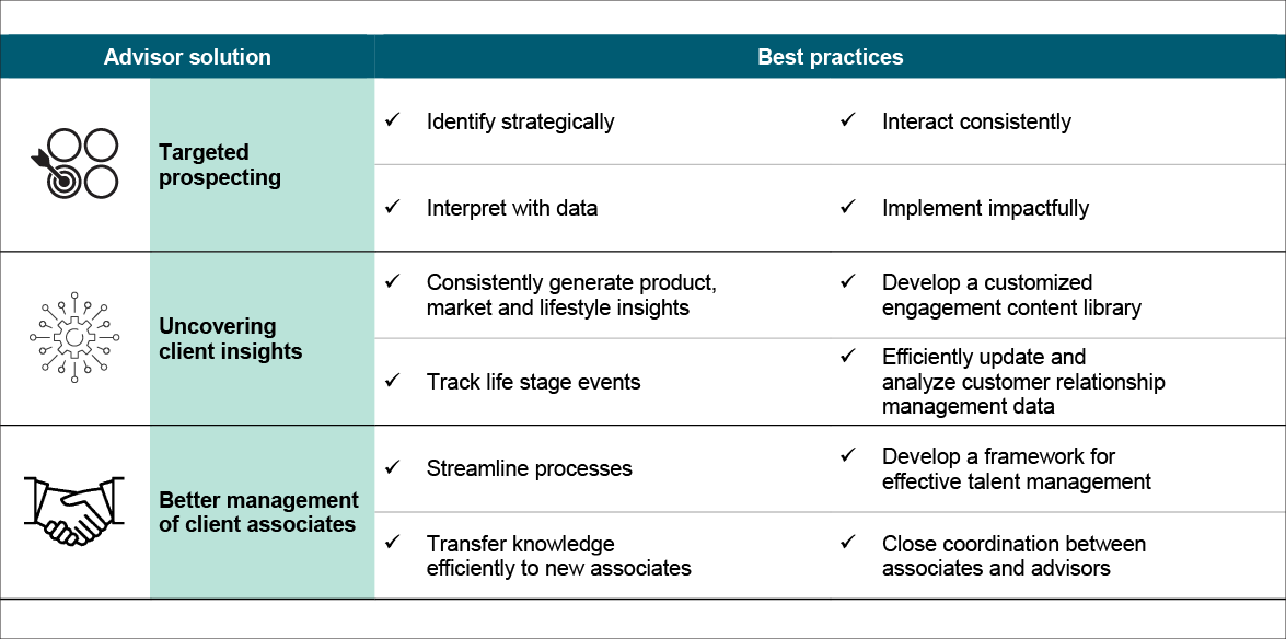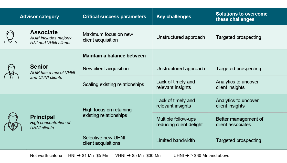 • Associate advisors, who are building their client base, require significant support with new client acquisition, particularly among high-net-worth individuals (HNIs) and very-high-net-worth individuals (VHNIs). Their primary objective is to generate sufficient revenue while acquiring high-quality clients with growth potential.